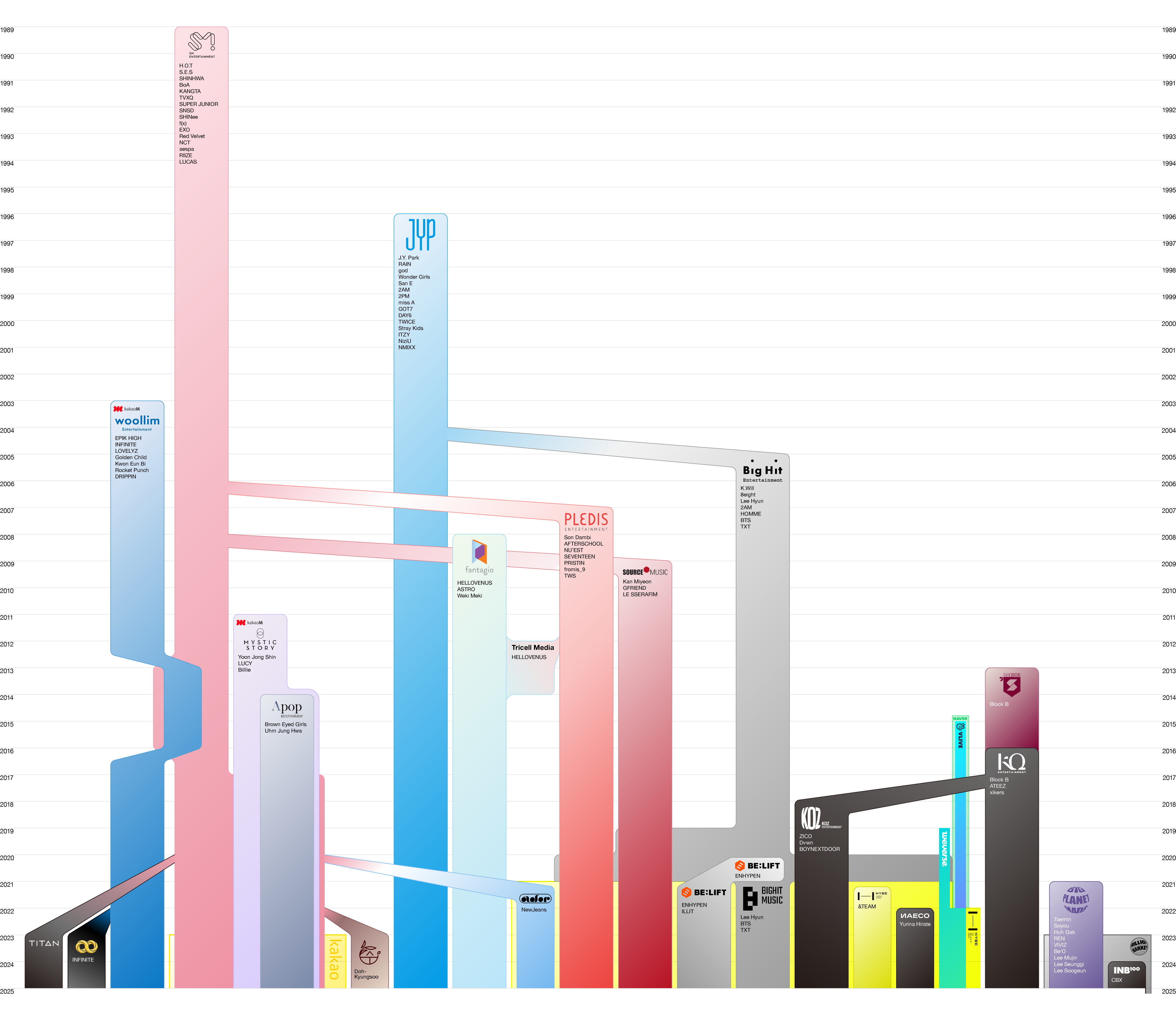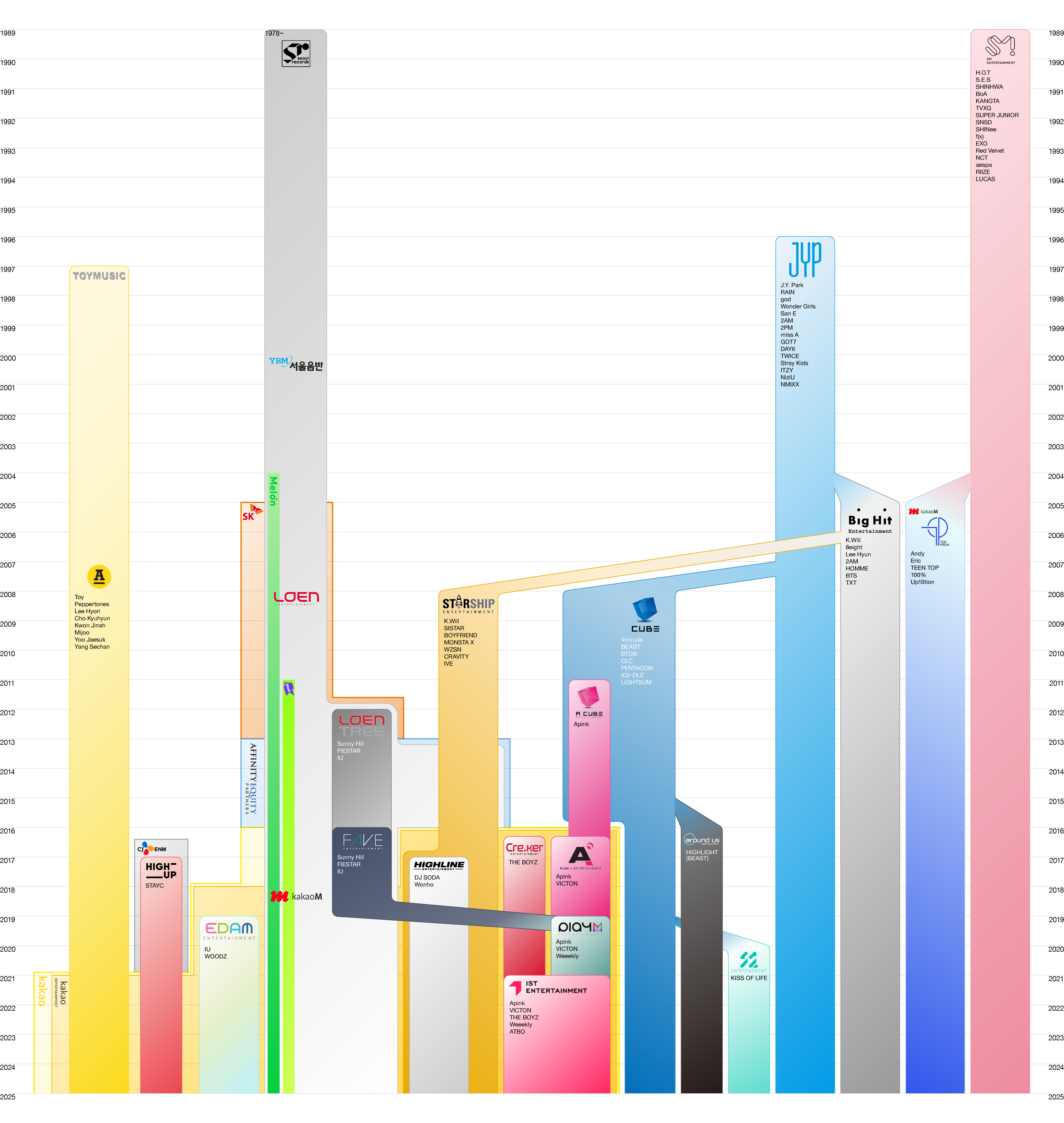 事務所同士の関わりは、資本だけではなく人や文化の移動(ex. SMから独立したミン・ヒジンがADORを立ち上げた)も含んでいます。個人的には人の移動のほうが作品づくりに影響するな〜と思っています。